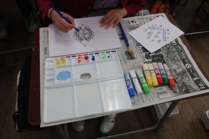 そこで今回は、去年よりもステップアップした花にしようと、水彩で色を塗ることにしました。きれいな色を作ろうと、工夫していました。