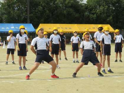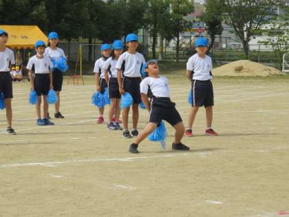 応援合戦では、5・6年生のみが参加する競技になりましたが、気合十分!2mの距離をとりながら、大きな声で表現する子供たちです。