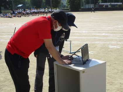 中学年はグラウンド東側で、低学年はリモート中継で、開会式に参加しました。