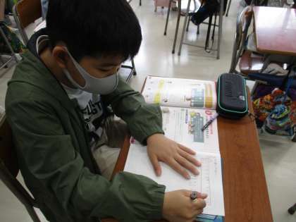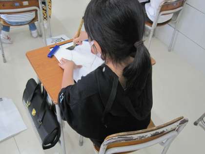 写真中:書写では、「かまえ」に気を付けてバランスよく書く練習をしています。