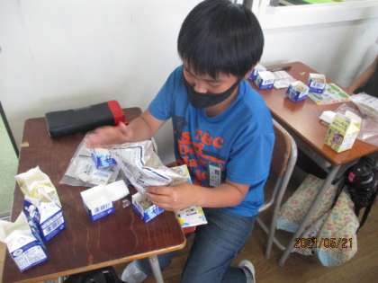 以前からためていた牛乳パックを使いやすいサイズに切断し、土を入れて種を植えました。また別の牛乳パックには脱脂綿をひき、種をそこにのせました。