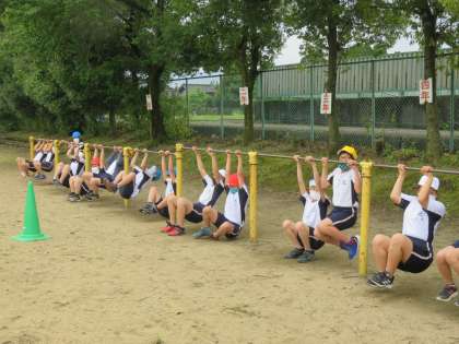 今日は鉄棒運動で「だんごむし」に全員で取り組んでみました。肘を曲げて体の位置を保持することは難しいです。保護者の皆さんも、昔を思い出して、一緒にやってみてはいかがでしょうか。