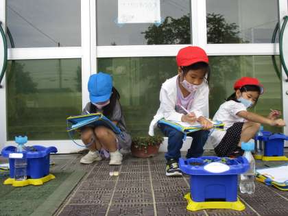 探検バックを持って、観察カードにあさがおの芽を描きました。