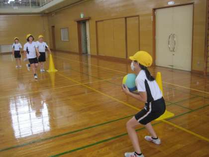 体育では、ボールを体の前でしっかりキャッチしたり、取りやすいように投げる練習をしています。