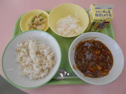 5月25日(火)の献立は、麦ごはん・牛乳・食べキリンハヤシ・豆豆サラダ・フルーツヨーグルトでした。