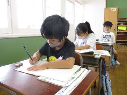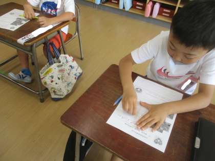 ノートやワークシートに書きとりをしたり、自分の考えをきちんと書いています。