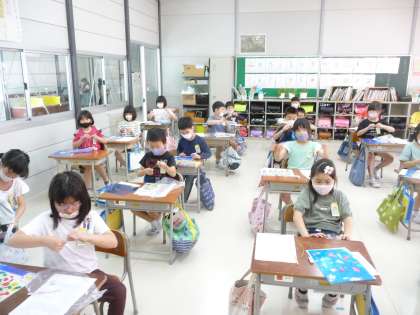 「光のプレゼント」を仕上げています。モールを通して完成です。完成した作品は、教室の前に掲示しました。