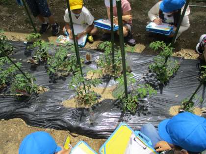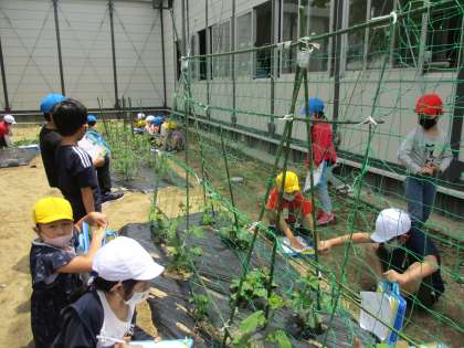 「花がさいたよ」「ふさふさしている」「小さいきゅうりができた」と変化に気付きました。