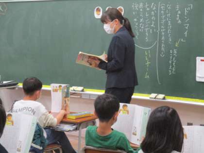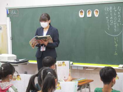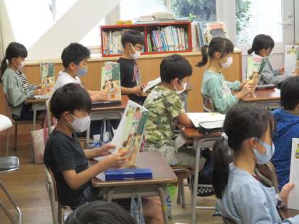 道徳の授業です。 先生が資料を読み、子供たちは黙読をしています。