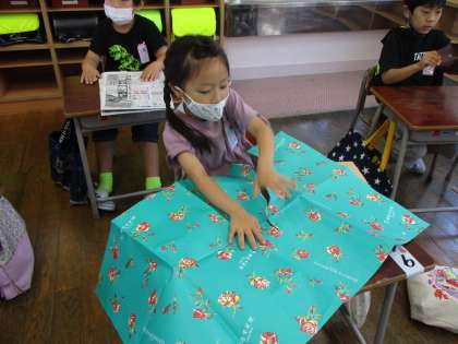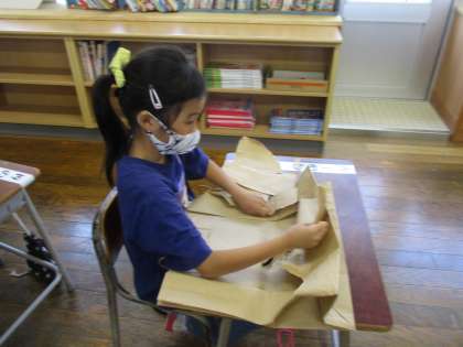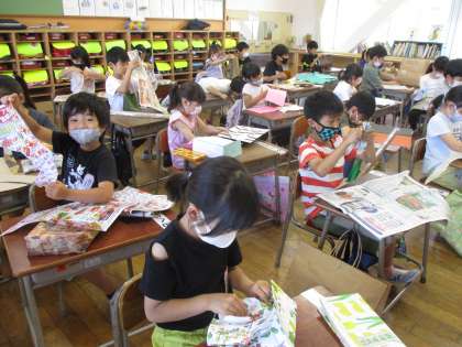 家から持ってきた、チラシや包装紙を破って、その形から動物やの乗り物などを作りました。