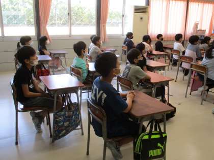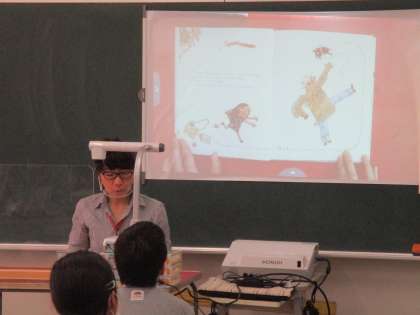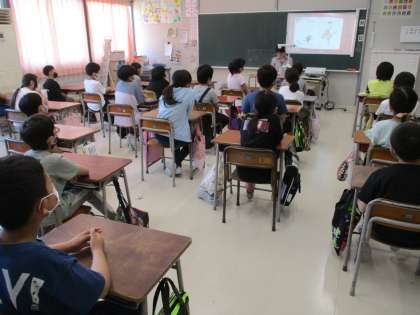 写真は、4年生です。絵本の絵をプロジェクタに映して、お話をしています。