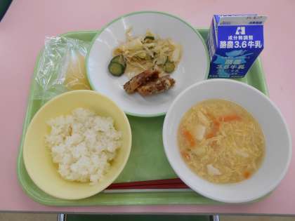 6月1日(火)今日の献立は、ごはん・牛乳・ちくわの南部揚げ・春雨サラダ・かき玉汁・冷凍りんごでした。