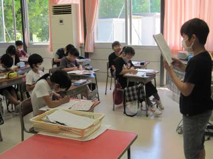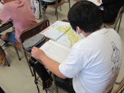 国語では都道府県の漢字を確認しながら、特産物も一緒に調べて文にしました。地図帳を使って真剣に調べていました。
