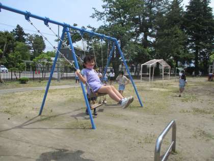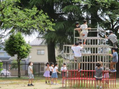 休み時間は、わんぱく広場で体を動かしています。1年生と仲良く遊具を使っています。
