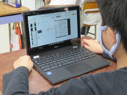 いくつか選定したノートを担任がスライドにまとめ、各自のパソコンで内容の確認をしています。これをきっかけに、自分の取組を見つめ直す子供たちでした。