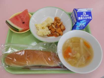 6月7日(月)の献立は、コッペパン・牛乳・鶏肉のトマト炒め・冷製ポテト・マカロニスープ・すいか でした。