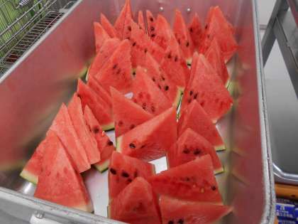 今日は、すいかの話をしました。すいかは、「夏の果実の王様」とよばれています。それは、すいかには熱中症対策に必要な水分がたくさん含まれているからです。また、スポーツドリンクに含まれているカリウムを含んでいるので、塩をかけて食べるとスポーツドリンクと同じような働きをしてくれます。運動の合間の水分補給にもいいですね。暑くて食欲がない日は、朝ごはんにすいかを食べると、頭がシャキッとして、元気になりますよ。