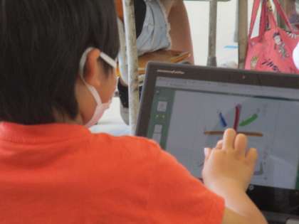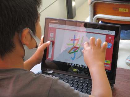 パソコン画面で、正しい筆順で指でなぞり書きをしています。