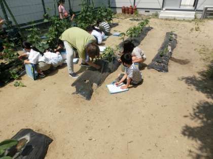 昨日、野菜先生に来ていただき、野菜の育て方やアブラムシ対策などを教えていただきました。実がなってきた野菜があり、収穫を楽しみにしています。