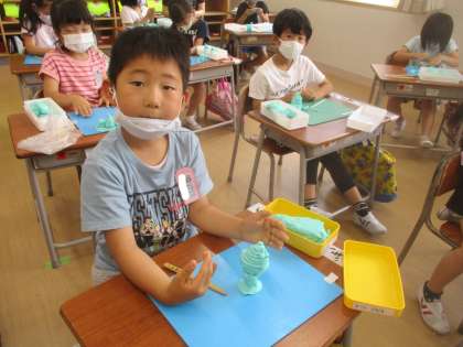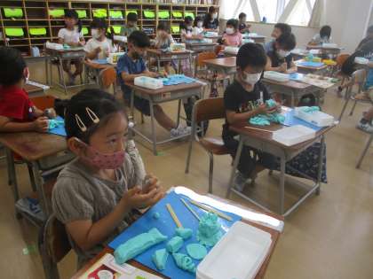 図工の学習では、ねんどを使っていろいろな食べ物を作りました。