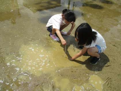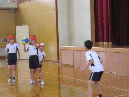 体育では、正確にパスできるように、いろいろなボールの投げ方を練習しています。