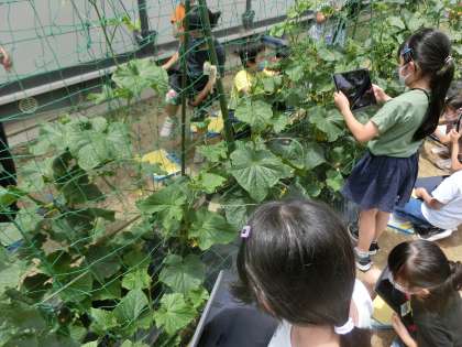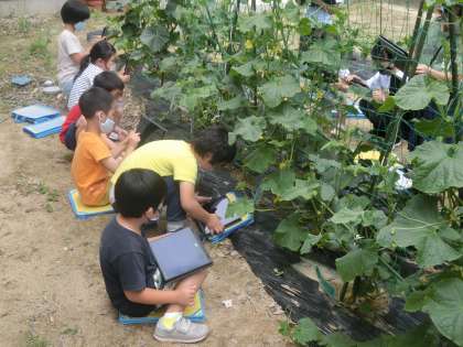 色を綿棒でぼかしながら自分だけの色で野菜の絵を描いていました。そろそろ実がなってくる時期なので、子どもたちは育てた野菜が食べることができるのを楽しみにしています。