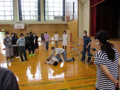 教職員と育成会の皆さんが参加し、大沢野消防署職員の方を招いて救命講習会を開きました。