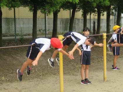 鉄棒運動ではこれまでできた技の確認をしたり、発展技に挑戦したりしました。じゃんけんもしたりしながら、楽しんで学習をしています。
