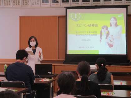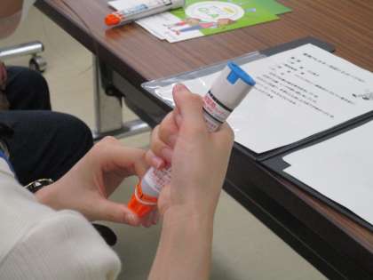 本日、学校薬剤師様をお招きし、アナフィラキシーに備えるため、エピペン講習会を開きました。