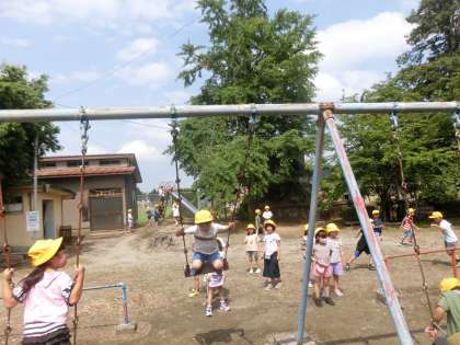 願念坊祭りについてお話を聞いた後、新宮公園で遊びました。滑り台や鉄棒だけでなく、初めて土俵での相撲を楽しんでいました。