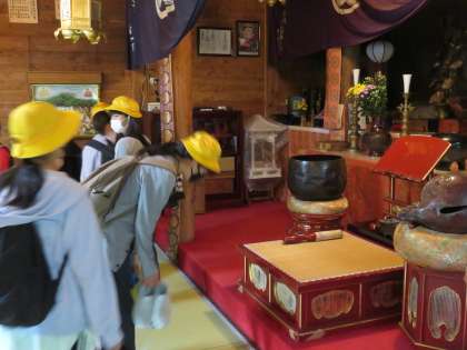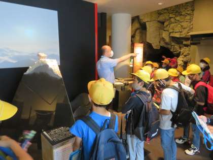 6月25日(金) 6年生 校外学習4 公開日 2021/06/25 更新日 2021/06/25 2023年度 6年生 上の写真は、閻魔堂に特別にお邪魔させていただいたときです。閻魔様に会った子供たちは、思わず頭を下げていました。 下の写真は、雄山山頂の景色を学芸員の先生に説明していただいている場面です。