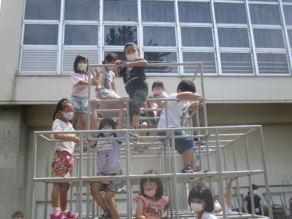 わんぱく広場は、子供たちが思い思いに遊んでいました。ジャングルジムやブランコ、梅の実集めなどど、楽しんでいました。