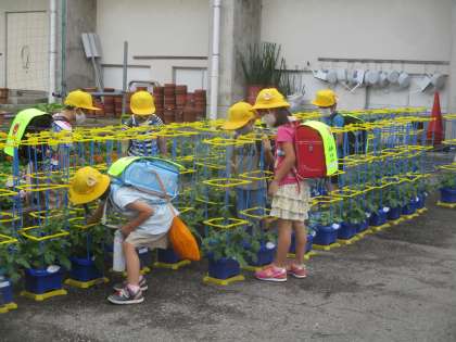 登校すると、すぐにあさがおの鉢の所に行く子供たち。