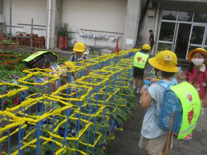 「あっ、花がさいたよ。」「つるが、ぼくの背より大きい。」など、あさがおの成長を楽しみにしています。