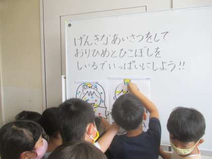 6月30日(水) 1年生 あいさつ運動 公開日 2021/06/30 更新日 2021/06/30 2023年度 1年生 あいさつ運動が始まりました。この機会に、1年生は、自分から進んであいさつをしようと取り組んでいます。 あいさつをして、がんばりシールを七夕のイラストに貼っています。