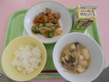 7月1日(木)の献立は、ごはん・牛乳・魚の野菜あんからめ・華風和え・豆腐スープでした。