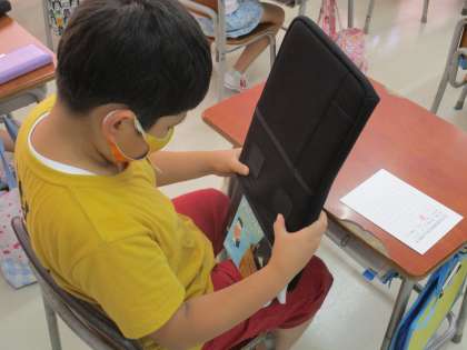 写真は、2年生の帰りの会で、専用バッグにパソコンを入れているところです。