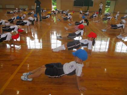 体育では、力試しの運動遊びをしています。