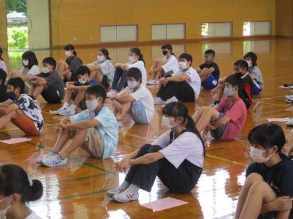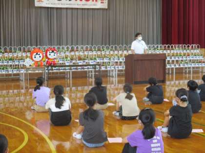 感染症拡大防止のため、会場である体育館には6年生と5年生と4年生の代表児童が参加し、他の児童は教室でオンラインで繋いで参加しました。