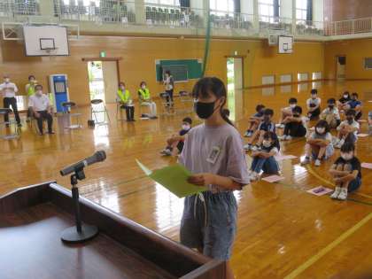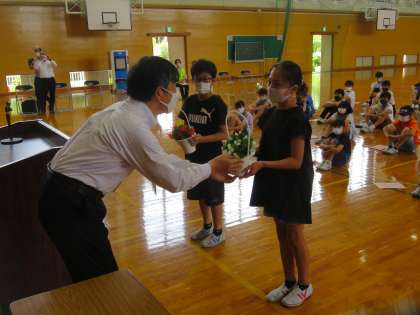代表児童が花鉢を受け取り、お世話を通して優しさや思いやりの心を育むことを約束しました。今日、受け取った花鉢は夏休みの間、各家庭でお世話することになります。水やりを忘れず、大切に育てた花鉢は2学期に地域へと届ける予定です。