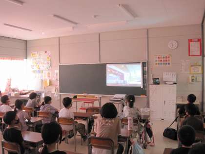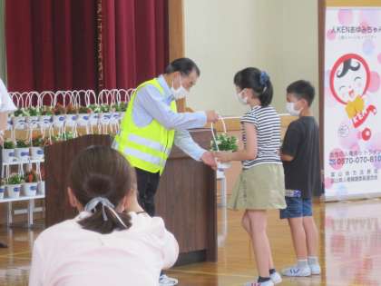 昨日、4年生は、オンラインで「人権の花運動」に参加しました。代表の児童は、体育館でベコニアの鉢を受け取りました。