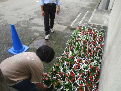 体育館から鉢を一人一つずつ移動させました。そっと優しく運んでいました。