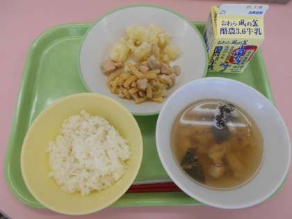 7月13日(火)の献立は、ごはん・牛乳・あっさりチキン・こふきいも・沢煮椀でした。
