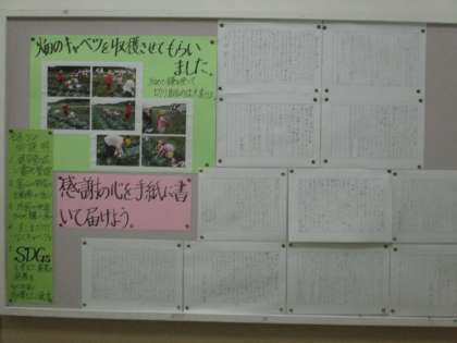 5年生は、健菜堂様への感謝の手紙を書くとともに、収穫させていただいたキャベツを家庭で様々な料理を作りました。写真は、感謝の手紙のコピーと調理レポートの一部です。