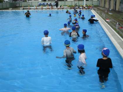 水中での着衣の感覚を体験しています。 衣服が水を吸収し、重く感じます。