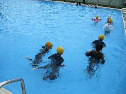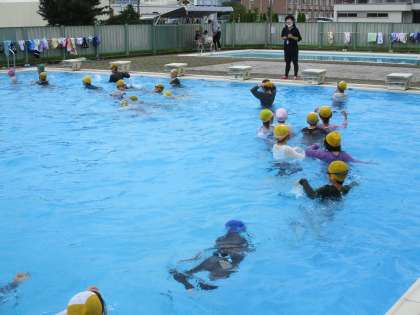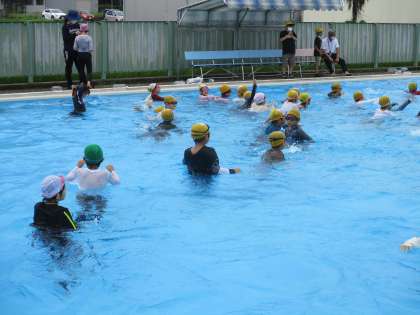 服をきたままプールの中を歩きます。 服が水をふくみ、歩きにくいです。