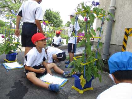 生活科で育ててきたあさがおが、たくさんの花を咲かせました。