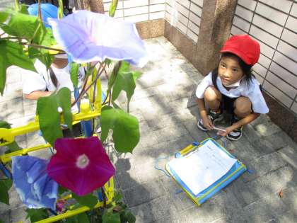 「いろいろな色の花があるね。」「わたしの花は青紫色だったよ。」「6つも咲いたよ。」とうれしそうにしている子どもたちです。