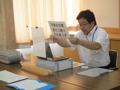 太陽が「自ら光り輝く」ように、主体的に考え自分から行動することが大切であることや、36日間の夏休みで「チャレンジ」し、さらに「輝く大久保っ子」に成長してほしいことを伝えました。