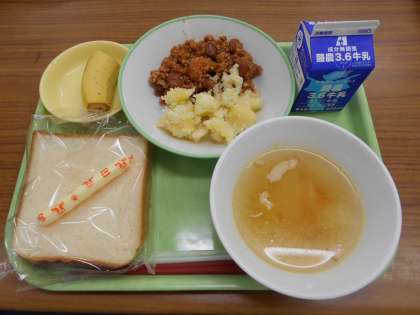 8月30日(月)の献立は、食パン・牛乳・チリコンカン・こふきいも・野菜スープ・棒チーズ・バナナでした。今日から2学期の給食が始まりました。「給食おいしかった!」という声がたくさん聞けました。